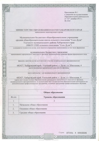 - Места осуществления образовательной деятельности по дополнительным профессиональным программам: 682427, Хабаровский край, Ульчский район, село Дуди, Школьная улица, 4