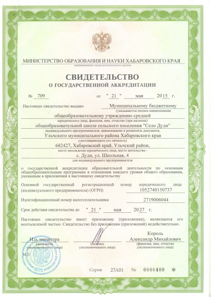 - Места проведения государственной итоговой аттестации: 682427, Хабаровский край, Ульчский район, село Дуди, Школьная улица, 4